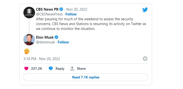 "Now what are we all worried about? Elon Musk goes out and buys an outfit that sends and spews lies all across the world."[9]On May 18, 2022, Musk tweeted:[10]
