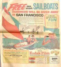 The Snark was used as a promotional tie-in with numerous companies including Coca-Cola, Vicks and Budweiser.[13] In 1968, the San Francisco Chronicle ran ads for Mail-a-way, offering Snark sailboats as a giveway in a promotion of their Kodak film processing service.