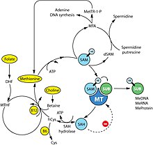 The products of these reactions are methylated DNA, RNA or proteins and S-adenosylhomocysteine (SAH). SAH has a negative feedback on its own production as an inhibitor of methyltransferase enzymes. Therefore, SAM:SAH ratio directly regulates cellular methylation, whereas levels of vitamins B6, B12, folic acid and choline regulates indirectly the methylation state via the methionine metabolism cycle.[45][46] A near ubiquitous feature of cancer is a maladaption of the methionine metabolic pathway in response to genetic or environmental conditions resulting in depletion of SAM and/or SAM-dependent methylation. Whether it is deficiency in enzymes such as methylthioadenosine phosphorylase, methionine-dependency of cancer cells, high levels of polyamine synthesis in cancer, or induction of cancer through a diet deprived of extrinsic methyl donors or enhanced in methylation inhibitors, tumor formation is strongly correlated with a decrease in levels of SAM in mice, rats and humans.[47][48]