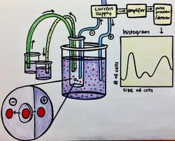 A 3-part differential cell counter uses Coulter's Principle to find the size and volume of the cell. The sample is lysed and dissolved into an electrolyte solution in a container, which also holds a smaller container. The smaller container has 2 pumps running to and from its solution, one creating a vacuum and the other replacing the lost solution. The smaller container has a small hole (an orifice) near the bottom of the container. Coulter's principle is applied through the use of two electrodes. One electrode (the internal electrode) is within the smaller container, and the other (the external electrode) is outside of the smaller container but within the electrolyte/sample solution. As the vacuum draws the sample cells through the orifice, the cell momentarily causes electrical resistance to the current as it passes through the orifice. This resistance is recorded, measured, amplified, and processed which can then be interpreted by the computer into a histogram. The 3-part analyzer is able to differentiate between 3 types of WBC's, neutrophils, lymphocytes, and monocytes.[7]