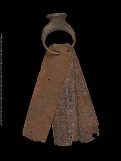 Of the ancient settlement of Palāśikā no architectural remains have been found, but A. Sundara has noted traces of brick structures near the Kalleśvara temple (also known as Kalameshwar) on the west side of the town.[3] The main evidence of early Palāśikā is a series of copper plates discovered in the 1850s at a location then known as Cakratīrtha.[4] Fleet states that the plates "were found some sixteen years ago in a mound of earth close to a small well called Chakratîrtha, a short distance outside Halsi on the road to Nandigaḍ."[5] The charters all record Jain grants and range from the time of Kākutsthavarman (c. 405-430) through Ravivarman (c. 465-500) and Harivarman (c. 500-15).[6]