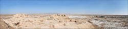 Khwarazm (/xwəˈræzəm/; Old Persian: Hwârazmiya; Persian: خوارزم, Xwârazm or Xârazm) or Chorasmia (/kəˈræzmiə/) is a large oasis region on the Amu Darya river delta in western Central Asia, bordered on the north by the (former) Aral Sea, on the east by the Kyzylkum Desert, on the south by the Karakum Desert, and on the west by the Ustyurt Plateau. It was the center of the Iranian[1] Khwarezmian civilization, and a series of kingdoms such as the Afrighid dynasty and the Anushtegin dynasty, whose capitals were (among others) Kath,[2] Gurganj (now Konye-Urgench) and—from the 16th century on—Khiva. Today Khwarazm belongs partly to Uzbekistan and partly to Turkmenistan.