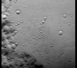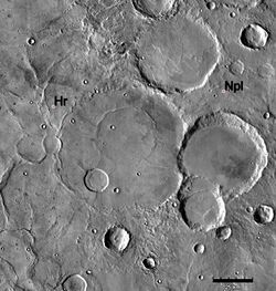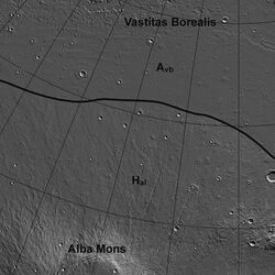 The lower boundary of the Hesperian System is defined as the base of the ridged plains, which are typified by Hesperia Planum and cover about a third of the planet's surface.[3] In eastern Hesperia Planum, the ridged plains overlie early to mid Noachian aged cratered plateau materials (pictured left).[15] The Hesperian's upper boundary is more complex and has been redefined several times based on increasingly detailed geologic mapping.[3][12][26] Currently, the stratigraphic boundary of the Hesperian with the younger Amazonian System is defined as the base of the Vastitas Borealis Formation[27] (pictured right). The Vastitas Borealis is a vast, low-lying plain that covers much of the northern hemisphere of Mars. It is generally interpreted to consist of reworked sediments originating from the Late Hesperian outflow channels and may be the remnant of an ocean that covered the northern lowland basins. Another interpretation of the Vastitas Borealis Formation is that it consists of lava flows.[28]