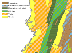 Before the Miocene uplift of the Principal Cordillera was over, the Frontal Cordillera to the east started a period of uplift that lasted from 12 to 5 million years ago. Further east the Precordillera was uplifted in the last 10 million years and the Sierras Pampeanas has experienced a similar uplift in the last 5 million years. The more eastern part of the Andes at these latitudes had their geometry controlled by ancient faults dating to the San Rafael orogeny of the Paleozoic.[33] The Sierras de Córdoba (part of the Sierras Pampeanas) where the effects of the ancient Pampean orogeny can be observed, owes it modern uplift and relief to the Andean orogeny in the late Cenozoic.[36][37] Similarly the San Rafael Block east of the Andes and south of Sierras Pampeanas was raised in the Miocene during the Andean orogeny.[38] In broad terms the most active phase of orogeny in area of southern Mendoza Province and northern Neuquén Province (34–38° S) happened in the Late Miocene while arc volcanism occurred east of the Andes.[38]
