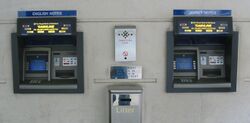 ATMs are known by a variety of names, including automatic teller machines (ATM) in the United States[1][2][3] (sometimes redundantly as "ATM machine"). In Canada, the term automated banking machine (ABM) is also used,[4][5] although ATM is also very commonly used in Canada, with many Canadian organizations using ATM over ABM.[6][7][8] In British English, the terms cashpoint, cash machine and hole in the wall are most widely used.[9][better source needed] Other terms include any time money, cashline, tyme machine, cash dispenser, cash corner, bankomat, or bancomat. ATMs that are not operated by a financial institution are known as "white-label" ATMs.