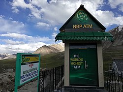 The world's highest ATM is located at the Khunjerab Pass in Pakistan . Installed at an elevation of 4,693 metres (15,397 ft) by the National Bank of Pakistan, it is designed to work in temperatures as low as -40-degree Celsius.[61]