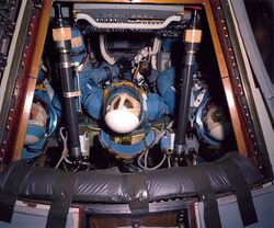 The high-pressure oxygen atmosphere was similar to that which had been used successfully in the Mercury and Gemini programs. The pressure before launch was deliberately greater than ambient in order to drive out the nitrogen-containing air and replace it with pure oxygen, and also to seal the plug door hatch cover. During the launch, the pressure would have been gradually reduced to the in-flight level of 5 psi (34 kPa), providing sufficient oxygen for the astronauts to breathe while reducing the fire risk. The Apollo 1 crew had successfully tested this procedure with their spacecraft in the Operations and Checkout Building altitude (vacuum) chamber on October 18 and 19, 1966, and the backup crew of Schirra, Eisele and Cunningham had repeated it on December 30.[36] The investigation board noted that, during these tests, the command module had been fully pressurized with pure oxygen four times, for a total of six hours and fifteen minutes, two and a half hours longer than it had been during the plugs-out test.[17]:4-2[lower-alpha 2]