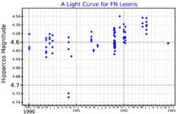 72 Leonis is a single[9] variable star in the zodiac constellation of Leo, located roughly 1,000 light years away from the Sun.[1] It has the variable star designation FN Leonis; 72 Leonis is the Flamsteed designation. In Chinese astronomy, 72 Leonis is called 虎賁, Pinyin: Hǔbēn, meaning Emperor’s Bodyguard, because this star is marking itself and stands alone in the Emperor’s Bodyguard asterism, Supreme Palace enclosure mansion (see : Chinese constellation).[10]