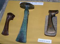 Clay miniature axes (axes, hammers or double axes) belonging to this period have been found. Labrys double-axes are frequently found in the Cretan and Mycenaean worlds, where they occur most often in complex rituals and tombs (for example the Tomb of double ax of Knossos). In the Mycenaean context, the labrys has a wide range of sizes, from miniature forms to giant forms that measure 1.20 meters. However, the labrys site is frequently associated with the moon and can be a symbol of a goddess of vegetation, the forerunner of Demeter, who, on Mycenaean seals, is found under a tree. The goddess has an ax in her hand and receives as gifts poppies and fruits.{{citation needed|date=January 2012}