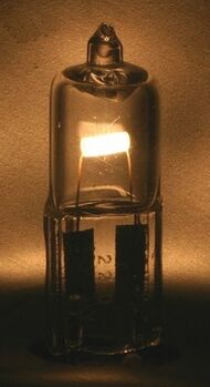 A halogen lamp (also called tungsten halogen, quartz-halogen, and quartz iodine lamp) is an incandescent lamp consisting of a tungsten filament sealed in a compact transparent envelope that is filled with a mixture of an inert gas and a small amount of a halogen, such as iodine or bromine. The combination of the halogen gas and the tungsten filament produces a halogen-cycle chemical reaction, which redeposits evaporated tungsten on the filament, increasing its life and maintaining the clarity of the envelope. This allows the filament to operate at a higher temperature than a standard incandescent lamp of similar power and operating life; this also produces light with higher luminous efficacy and color temperature. The small size of halogen lamps permits their use in compact optical systems for projectors and illumination. The small glass envelope may be enclosed in a much larger outer glass bulb, which has a lower temperature, protects the inner bulb from contamination, and makes the bulb mechanically more similar to a conventional lamp.[1]