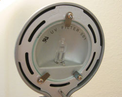 High-temperature filaments emit some energy in the UV region. Small amounts of other elements can be mixed into the quartz, so that the doped quartz (or selective optical coating) blocks harmful UV radiation. Hard glass blocks UV and has been used extensively for the bulbs of car headlights.[24] Alternatively, the halogen lamp can be mounted inside an outer bulb, similar to an ordinary incandescent lamp, which also reduces the risks from the high bulb temperature. Undoped quartz halogen lamps are used in some scientific, medical, and dental instruments as a UV-B source.