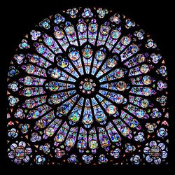 Gothic stained glass rose window of Notre-Dame de Paris. Some colors were achieved by colloids of gold nano-particles.