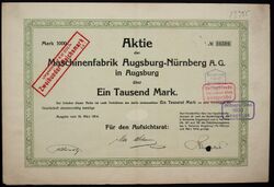 In 1898, the companies Maschinenbau-AG Nürnberg (founded 1841) and Maschinenfabrik Augsburg AG (founded 1840) merged to form Vereinigte Maschinenfabrik Augsburg und Maschinenbaugesellschaft Nürnberg A.G., Augsburg ("United Machine Works Augsburg and Nuremberg Ltd."). In 1908, the company was renamed Maschinenfabrik Augsburg Nürnberg AG, or in short, M·A·N.