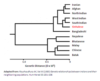 Genetic distance analysis by Roychoudhury AK et al. (1985) suggested the Sinhalese are more closely related to South and West Indian populations, than the Bengalis.[11]
