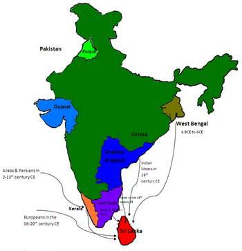 The hypothesized migration routes of the ancestors of the Sinhalese and other ethnic groups into Sri Lanka.