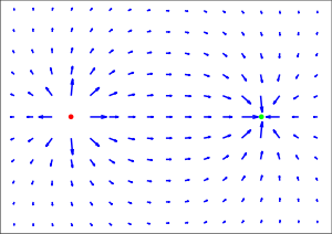 As is clear from the definition, the direction of the electric field is the same as the direction of the force it would exert on a positively-charged particle, and opposite the direction of the force on a negatively charged particle. Since like charges repel and opposites attract (as quantified below), the electric field tends to point away from positive charges and towards negative charges.