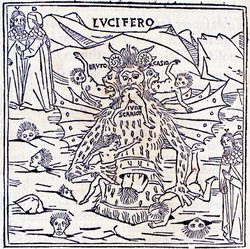 Having survived the depths of Hell, Dante and Virgil ascend out of the undergloom to the Mountain of Purgatory on the far side of the world. The Mountain is on an island, the only land in the Southern Hemisphere, created by the displacement of rock which resulted when Satan's fall created Hell[33] (which Dante portrays as existing underneath Jerusalem[34]). The mountain has seven terraces, corresponding to the seven deadly sins or "seven roots of sinfulness."[35] The classification of sin here is more psychological than that of the Inferno, being based on motives, rather than actions. It is also drawn primarily from Christian theology, rather than from classical sources.[36] However, Dante's illustrative examples of sin and virtue draw on classical sources as well as on the Bible and on contemporary events.