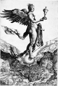Divine retribution is a major theme in the Greek world view, providing the unifying theme of the tragedies of Sophocles and many other literary works.[8] Hesiod states: "Also deadly Nyx bore Nemesis an affliction to mortals subject to death" (Theogony, 223, though perhaps an interpolated line). Nemesis appears in a still more concrete form in a fragment of the epic Cypria.