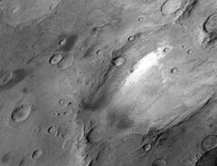 The impact that formed Copernicus likely occurred more than 3 billion years ago. The crater contains smaller craters within its basin and is particularly notable for gully formations that are presumed to be indicative of past liquid water flows. Many small channels exist in this area; they are further evidence of liquid water. On the basis of their form, aspects, positions, and location amongst and apparent interaction with features thought to be rich in water ice, many researchers believed that the processes carving the gullies involve liquid water. However, this remains a topic of active research. As soon as gullies were discovered,[2] researchers began to image many gullies over and over, looking for possible changes. By 2006, some changes were found.[3] Later, with further analysis it was determined that the changes could have occurred by dry granular flows rather than being driven by flowing water.[4][5][6] With continued observations many more changes were found in Gasa Crater and others.[7] With more repeated observations, more and more changes have been found; since the changes occur in the winter and spring, experts are tending to believe that gullies were formed from dry ice. Before-and-after images demonstrated the timing of this activity coincided with seasonal carbon-dioxide frost and temperatures that would not have allowed for liquid water. When dry ice frost changes to a gas, it may lubricate dry material to flow especially on steep slopes.[8][9][10] In some years frost, perhaps as thick as 1 meter.