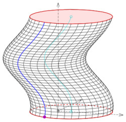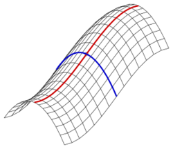 and contains the origin. Obviously this definition is symmetric regarding the curves [math]\displaystyle{ c_1 }[/math] and [math]\displaystyle{ c_2 }[/math]. Therefore, both curves are called generatrices (one: generatrix). Any point [math]\displaystyle{ X }[/math] of the surface is contained in a shifted copy of [math]\displaystyle{ c_1 }[/math] and [math]\displaystyle{ c_2 }[/math] resp.. The tangent plane at [math]\displaystyle{ X }[/math] is generated by the tangentvectors of the generatrices at this point, if these vectors are linearly independent.