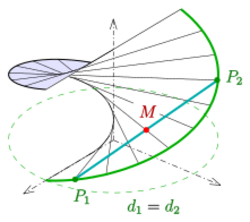 In diagram: [math]\displaystyle{ P_1: \delta_1(\alpha_0) }[/math] lies on the helix [math]\displaystyle{ d_1 }[/math] and [math]\displaystyle{ P_2: \delta_2(\varphi_0) }[/math] on the (identical) helix [math]\displaystyle{ d_2 }[/math]. The midpoint of the chord is [math]\displaystyle{ \ M: \frac{1}{2}(\delta_1(\alpha_0) +\delta_2(\varphi_0))=\vec X(\alpha_0,\varphi_0)\ }[/math].