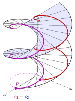 The common point used for the diagram is [math]\displaystyle{ P=\vec X(0,0)=(2a,0,0) }[/math]. The (identical) generatrices are helices with the turn around shift [math]\displaystyle{ k\pi\;, }[/math] which lie on the cylinder with the equation [math]\displaystyle{ (x-a)^2+y^2=a^2 }[/math]. Any parametric curve is a shifted copy of the generatrix [math]\displaystyle{ c_1 }[/math] (in diagram: purple) and is contained in the right circular cylinder with radius [math]\displaystyle{ a }[/math], which contains the z-axis.