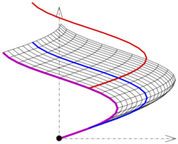 has a turn around shift (German: Ganghöhe) [math]\displaystyle{ 2\pi k }[/math]. Introducing new parameters [math]\displaystyle{ \alpha, \varphi }[/math][6] such that
