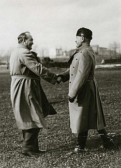 The March on Rome brought fascism international attention. One early admirer of the Italian fascists was Adolf Hitler, who less than a month after the March had begun to model himself and the Nazi Party upon Mussolini and the Fascists.[186] The Nazis, led by Hitler and the German war hero Erich Ludendorff, attempted a "March on Berlin" modeled upon the March on Rome, which resulted in the failed Beer Hall Putsch in Munich in November 1923.[187]