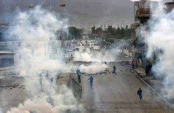 On 26 February, protesters in Sohar called for more jobs.[88] On the following day, tensions escalated with protesters burning shops and cars.[89] The police responded using tear gas to contain and disperse the crowds of protesters.[90] Demonstrations also spread to the region of Salalah, where protesters had reportedly been camping outside the provincial governor's house since 25 February.[90][91] In Sohar, witnesses claimed that two protesters were killed when police fired rubber bullets to disperse the crowds.[92][93][94][95] Witnesses further reported that protesters burnt a police station as well as the Wali's house (where the representative of the Sultan to Sohar stays).[96] The Omani protesters insisted that they were not challenging the rule of Sultan Qaboos, who has been in power since 1970, but were merely calling for jobs and reform.[97] The protesters even apologized to the Sultan for allowing violence rattle the city of Sohar on 28 February 2011.[98]