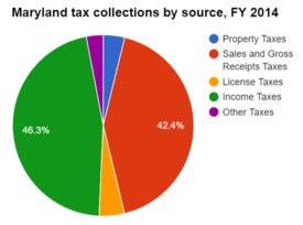 The table below lists 2014 tax collections by source as percentages of total collections. About 46.3 percent of Maryland's total state tax collections came from income taxes.[5]