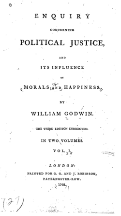 Godwin took individualism to the radical extent of opposing individuals performing together in orchestras, writing in Political Justice that "everything understood by the term co-operation is in some sense an evil".[91] The only apparent exception to this opposition to cooperation is the spontaneous association that may arise when a society is threatened by violent force. One reason he opposed cooperation is he believed it to interfere with an individual's ability to be benevolent for the greater good. Godwin opposes the idea of government, but wrote that a minimal state as a present "necessary evil" that would become increasingly irrelevant and powerless by the gradual spread of knowledge.[16] He believed democracy to be preferable to other forms of government.[94]