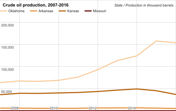 Crude oil production in Oklahoma and neighboring states (2007-2016)