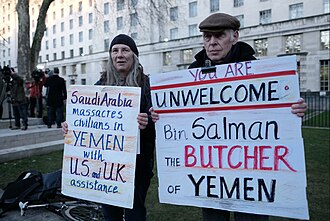 In response to a coup by Shiite Muslims (called Houthis) in Yemen, Saudi Arabia began a violent military intervention targeted at its southern neighbor. The Saudis justified themselves by claiming that the Houthis were proxies of Iran, a claim which was then untrue but eventually became reality.[136] The Saudi-led coalition has received both direct and indirect support from the United States and the UK.[137]