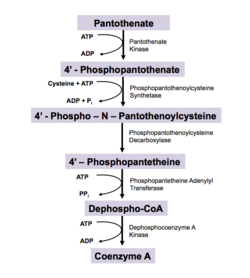 In all living organisms, coenzyme A is synthesized in a five-step process that requires four molecules of ATP, pantothenate and cysteine[13] (see figure):