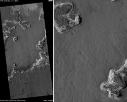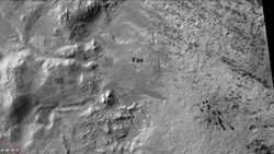 Ritchey Crater is interesting to scientists because it displays several different layers. A dark layer at the top forms a cap rock that protects the underlying layers from erosion. Under this hard, dark layer is a softer, light-toned rock, that breaks into small boulders. The layers might be formed of volcanic ash, lake or stream deposits, or sand dunes.[6] Fluvial channels and fan deposit are common on and along the walls.[7]