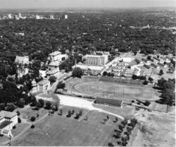 On June 8, 1966, only a few days after classes were dismissed for the summer, much of the campus was demolished by a tornado, and completely denuded of trees.[8] Three months before the tornado struck, the Washburn board of trustees had reinsured every building on campus for the maximum amount. A week after the tornado struck, summer classes began at Topeka West High School. By the fall of 1966, Stoffer Hall was repaired, and trailers were in place. It took years to reconstruct the campus, with students attending classes in trailers well into the early 1970s.[6]