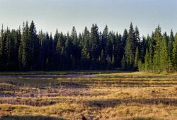 The plateau that contains the Indian Heaven Wilderness features forests, which are predominantly made up of Pacific silver fir, noble fir, and subalpine fir trees,[13] though there are also Western red cedars,[14] mountain hemlock,[15] grand firs, and Engelmann spruce.[16] Other flora found in the vicinity include an understory of huckleberry plants and beargrass,[17][14] in addition to colorful wildflowers;[18] vine maples;[19] flowering plants such as blueberry, heather,[15] vanilla leaf, and false hellebore;[16] and aromatic wintergreen.[17] Many of the area's lakes get stocked with trout species like cutthroat,[17] rainbow, and brook trout.[13] Amphibians such as frogs can be found in the wilderness,[15] while terrestrial animals in the area include deer, elk, and American black bears.[13] Because of the abundance of mosquitoes within the vicinity, Indian Heaven is sometimes informally referred to as Insect Heaven.[20]