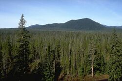 Located in Skamania County in the state of Washington (state) ,[3] Indian Heaven volcanic field is part of the High Cascades,[4] an eastern segment of the Cascade Range, which trends north–south.[5] Formed towards the end of the Pleistocene Epoch, these mountains are underlain by more ancient volcanoes that subsided due to parallel north–south faulting in the surrounding region.[6] The Indian Heaven field lies 40 miles (64 km) east of Vancouver, Washington and 14 miles (23 km) to the north of the Columbia River.[7]