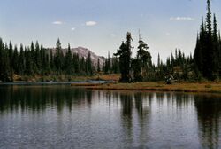 The Lake Wapiki trail, 9.6 miles (15.4 km) in length, gains 2,500 feet (760 m) in elevation and provides scenic views of Mount Adams and Mount Rainier.[31] The Blue Lake trail in the Indian Heaven wilderness area runs for 3.25 miles (5.23 km);[32] together with the Lemei Lake Trail, it forms a loop that last 12.3 miles (19.8 km).[18] A moderate hike, it offers views of lakes, ponds, meadows, and forests, as well as access to popular fishing lakes like Dee Lake, Heather Lake, Thomas Lake, and Eunice Lake.[33] These lakes are also popular swimming spots, particularly among hikers with children.[15] Before it merges with the Pacific Crest Trail, the route arrives at the Blue Lake, which has a depth of 46 feet (14 m) and marks the deepest lake within the entire wilderness. Blue Lake was carved by glacial motion.[34]