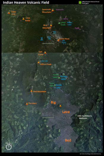 Indian Heaven is a volcanic field in Skamania County in the state of Washington (state) , in the United States.[2] Midway between Mount St. Helens and Mount Adams, the field dates from the Pleistocene to the early Holocene epoch. It trends north to south and is dominated by six small shield volcanoes; these shields are topped by small spatter and cinder cones, and the field includes a number of subglacial volcanoes and tuyas. The northernmost peak in the field is Sawtooth Mountain and the southernmost is Red Mountain; its highest point is Lemei Rock at an elevation of 5,925 feet (1,806 m).