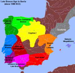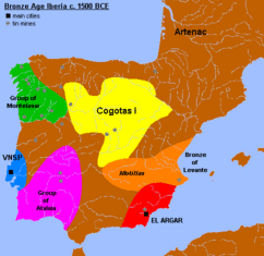 According to radiocarbon datings, the Middle Bronze Age began on the Northern Iberian Plateau in 1550 cal. BC.[4][5][6] In the three phases of the Iberian Bronze Age, different cultures emerged, which have been defined by regions with typical names: e.g. El Argar, Las Motillas, Bronce Atlántico, Bronce Valenciano, Montelavar, (Las Cogotas, Proto-Cogotas y Cogotas I) and others.[4][5]
