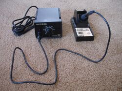 A soldering station is a multipurpose power soldering device designed for electronic components soldering. This type of equipment is mostly used in electronics and electrical engineering. Soldering station consists of one or more soldering tools connected to the main unit, which includes the controls (temperature adjustment), means of indication, and may be equipped with an electric transformer. Soldering stations may include some accessories – holders and stands, soldering tip cleaners, etc.