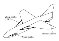 On both supersonic and subsonic types, smaller strakes are sometimes applied to the forward fuselage to control the fuselage flow at high angles of attack; for example, the Concorde had small nose strakes "to get a better directional stability".[1]