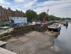 In redeveloping the Isle of Dogs and Royal Docks areas of east London during the late 1980s and early 1990s, the London Docklands Development Corporation invested in major new drainage infrastructure to manage future sewage and surface water run-off from proposed developments. Consulting engineer Sir William Halcrow & Partners designed a system of large diameter tunnels served by new pumping stations. In the Royal Docks, approximately 16 miles (25 km) of foul and surface water drains were built, plus pumping stations at Tidal Basin (designed by Richard Rogers Partnership) and North Woolwich (architect: Nicholas Grimshaw).[7] The Isle of Dogs drainage network is served by a stormwater pumping station situated in Stewart Street, designed by John Outram Associates.[8]