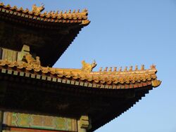Chinese imperial roof decorations or roof charms or roof-figures (Chinese: 檐獸/檐兽; pinyin: yán shòu) or "walking beasts" (Chinese: 走獸/走兽; pinyin: zǒu shòu) or "crouching beasts" (Chinese: 蹲獸/蹲兽; pinyin: Dūn shòu) were statuettes placed along the ridge line of official buildings of the Chinese empire. Only official buildings (palaces, government buildings, and some temples) were permitted to use such roof decorations.