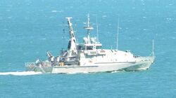 Boarding operations are performed by two 7.2-metre (24 ft), waterjet propelled rigid-hulled inflatable boats (RHIB), which carry ten people (a fully equipped, eight-strong boarding party, and two boat crew).[1] The RHIBs are larger and more powerful than the single RHIB aboard a Fremantle, are capable of operating independently of their mothership, and carry their own communications, navigation, and safety equipment.[1][13] Each RHIB has a dedicated cradle and davit, the boats can be launched and recovered easily, and a centralised 'dressing room' incorporated into the ship's design has streamlined the deployment and return of personnel.[1]