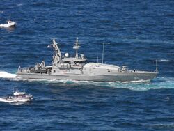 Nine companies expressed interest in the project; of these, seven had the required capability to build the ships.[4] These seven were narrowed down to three based on each tender's merit, competitiveness with the other tenders, and successful meeting of Australian industry involvement targets for both construction and long-term support.[4] Austal and Defence Maritime Services (DMS) partnered to offer twelve ships based on an expanded version of the latter's Bay-class patrol boat, in use with the Australian Customs Service.[1] The companies submitted two proposals for a 56-metre (184 ft) vessel, one with a steel hull, and one with an aluminium hull; the latter offering a 21% reduction in fuel consumption.[6] Australian Defence Industries (ADI) tendered a design based on the Royal Danish Navy's Flyvefisken-class patrol vessel.[7] The vessel was to be built with a glass-reinforced plastic hull, similar to ADI's Huon-class minehunters.[7] The Tenix proposal was a variant of a 56-metre (184 ft) search and rescue vessel constructed for the Philippine Coast Guard.[7] The tender was awarded to the Austal/DMS partnership in December 2003.[1][8] The contract was valued at $553 million, with each ship costing between $24 million and $28 million to construct.[1][2]