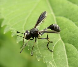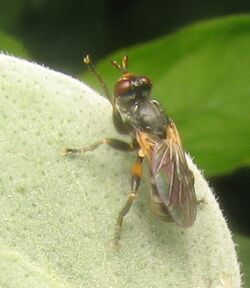The larvae of all conopids are internal parasites, most of aculeate (stinging) Hymenoptera. Adult females aggressively intercept their hosts in flight to deposit eggs. Accordingly, in the species Bombus terrestris, it has been shown that vulnerable foraging bees are likely the most susceptible to parasitism by conopids.[1] The female's abdomen is modified to form what amounts to a "can opener" to pry open the segments of the host's abdomen as the egg is inserted. The subfamily Stylogastrinae, including the genus Stylogaster, is somewhat different, in that the egg itself is shaped somewhat like a harpoon, with a rigid barbed tip, and the egg is forcibly jabbed into the host. Some species of Stylogaster are obligate associates of army ants, using the ants' raiding columns to flush out their prey. Certain members of the genus Physocephala have minor economic importance as parasites of honey bees. Some members of this genus, such as Physocephala tibialis have been shown to induce certain bumblebees to bury themselves before they die, allowing the adult fly to emerge from their hosts underground.[2][3] More research is needed to determine the life histories of most conopids.