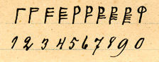 The number 4 is represented by four vertical lines on the horizontal stem, 5 is represented by what looks like a half-turned letter U, resembling the letter "P" in combination with the stem. 10 is represented by two turned U's opposing each other. More numbers up to 19 or 20, can be represented by a combination of I's and U's branching off of a stem, similar to how Roman numerals are represented by combinations of I's and V's.[lower-alpha 1]