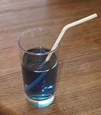 A straw dipped in a colored solution appears to be broken, because of the refraction of light as it passes from the solution to the air.